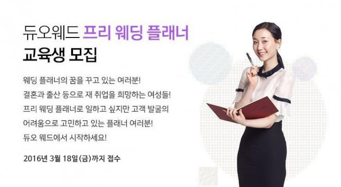 웨딩컨설팅 듀오웨드는 커리어 전문 교육기관 듀오 아카데미와 함께 오는 21일부터 '프리 웨딩플래너 교육 과정'을 특강으로 진행한다고 14일 밝혔다.