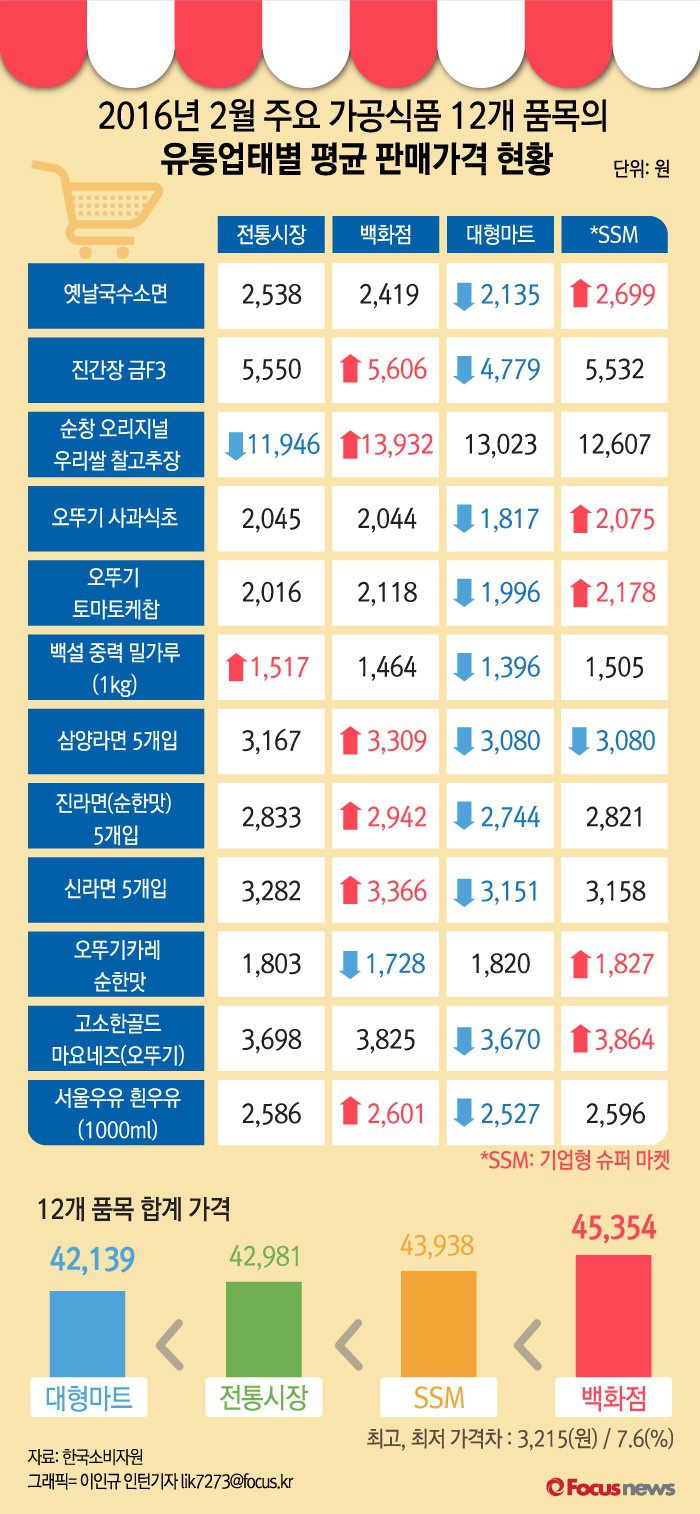 (서울=포커스뉴스) 한국소비자원은 14일 가격정보 종합포털 참가격을 통해 수집한 올해 2월 생필품 판매가를 분석한 결과 같은 제품이라도 대형마트나 백화점 등 유통업태에 따라 가격 차이가 최대 500원까지 난다는 조사결과가 나왔다.