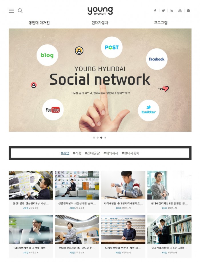 영현대 매거진 메뉴에서는 20대가 관심 있어 하고 흥미로워하는 주제인 자동차, 캠퍼스, 라이프, 커리어와 관련된 콘텐츠를 카드 뉴스, 클립 영상, 인포그래픽스 등의 다양한 형식으로 볼 수 있다.