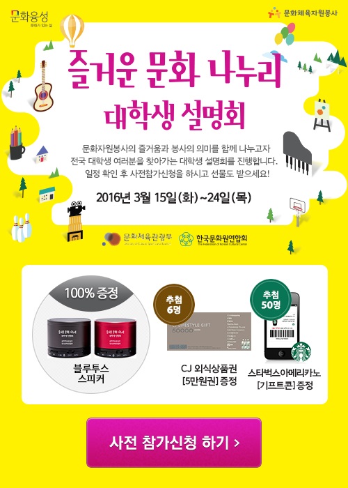 (서울=포커스뉴스) 문화체육관광부는 15일부터 24일까지 경북대, 인하대, 강릉원주대, 충북대, 전남대, 한양대 등 전국 6개 대학교에서 '문화체육자원봉사 대학생 설명회'를 개최한다.