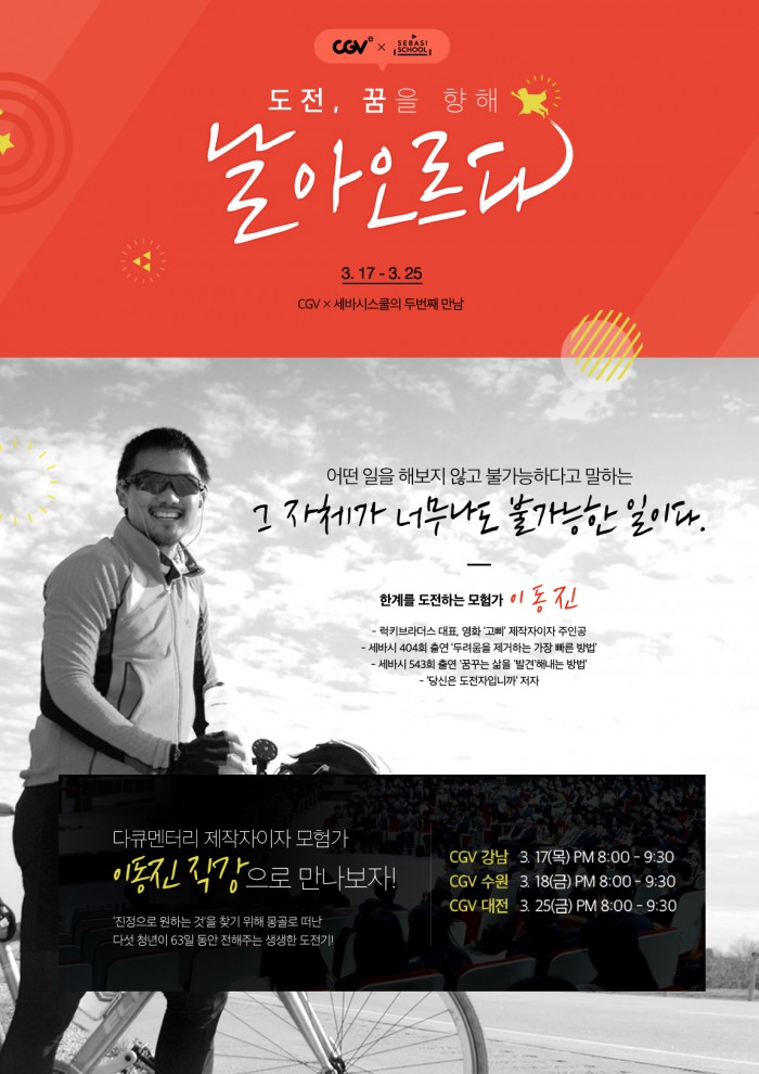 CGV와 세바시 클럽이 함께 마련한 이번 프로그램에서 이동진은 꿈을 실현시키기 위해 새로운 도전을 계획한 대학생과 청년들을 대상으로 도전에 관한 진솔한 강연을 펼친다.