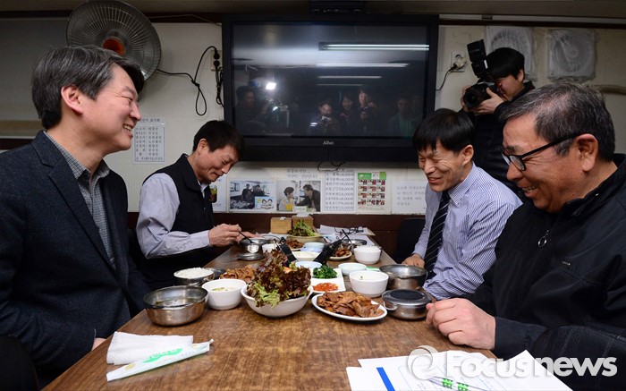 (서울=포커스뉴스) 15일 오후 서울 마포구 연남동 한 기사식당에서 안철수 국민의당 상임공동대표가 택시기사와 간담회를 갖고 있다.