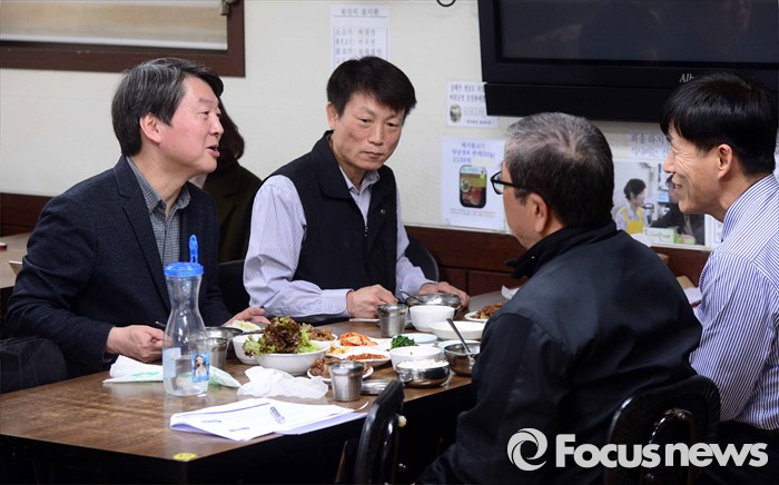 (서울=포커스뉴스) 15일 오후 서울 마포구 연남동 한 기사식당에서 안철수 국민의당 상임공동대표가 택시기사와 간담회를 갖고 있다.