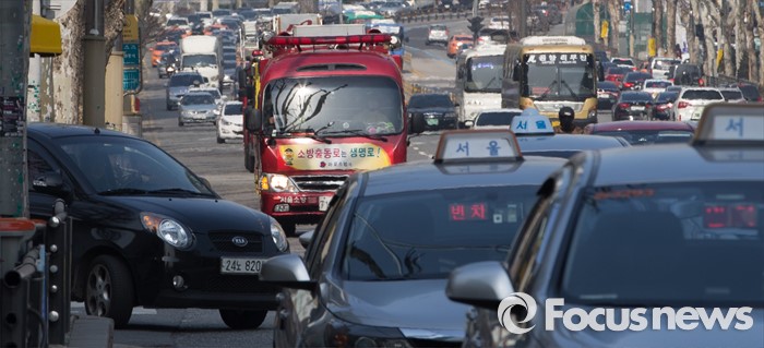 (서울=포커스뉴스) 올해 첫 민방위 훈련이 실시된 15일 오후 서울 마포대로 일대에서 마포소방서 소속 소방차가 길터주기 국민참여 훈련을 하고 있다.