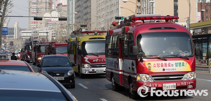 | △ 소방차 길터주기 훈련하는 마포소방서 |