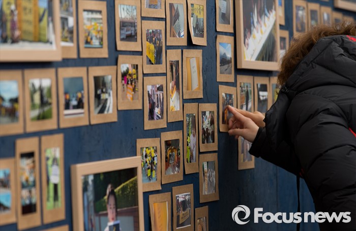 (서울=포커스뉴스) 15일 오후 서울 광화문광장에서 416가족협의회와 4.16연대가 세월호 700일 기획전시 개관식 및 2주기 추모의 달 공표 기자회견 후 기획전시관을 살펴보고 있다.