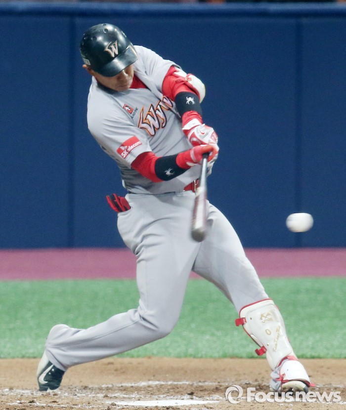 (서울=포커스뉴스) 15일 서울 고척스카이돔에서 열린 2016 프로야구 시범경기 SK-넥센 경기 4회 2사후 만루홈런을 친 SK 김강민이 타격하고 있다.