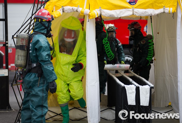 (서울=포커스뉴스) 15일 오후 서울 서초구 고속터미널 광장에서 훈련 참가자들이 시민안전확보를 위한 유관기관 합동 대테러 종합훈련을 하고 있다.