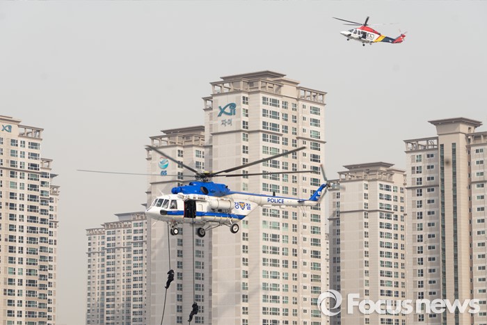 (서울=포커스뉴스) 15일 오후 서울 서초구 고속터미널 광장에서 훈련 참가자들이 시민안전확보를 위한 유관기관 합동 대테러 종합훈련을 하고 있다.