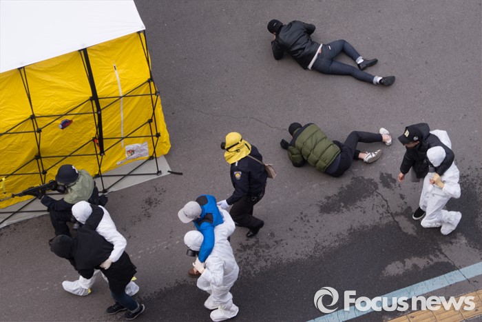 (서울=포커스뉴스) 15일 오후 서울 서초구 고속터미널 광장에서 훈련 참가자들이 시민안전확보를 위한 유관기관 합동 대테러 종합훈련을 하고 있다.