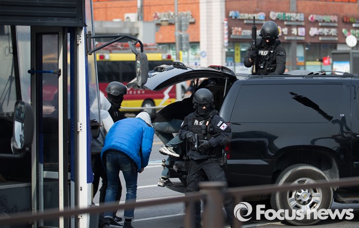 (서울=포커스뉴스) 15일 오후 서울 서초구 고속터미널 광장에서 훈련 참가자들이 시민안전확보를 위한 유관기관 합동 대테러 종합훈련을 하고 있다.