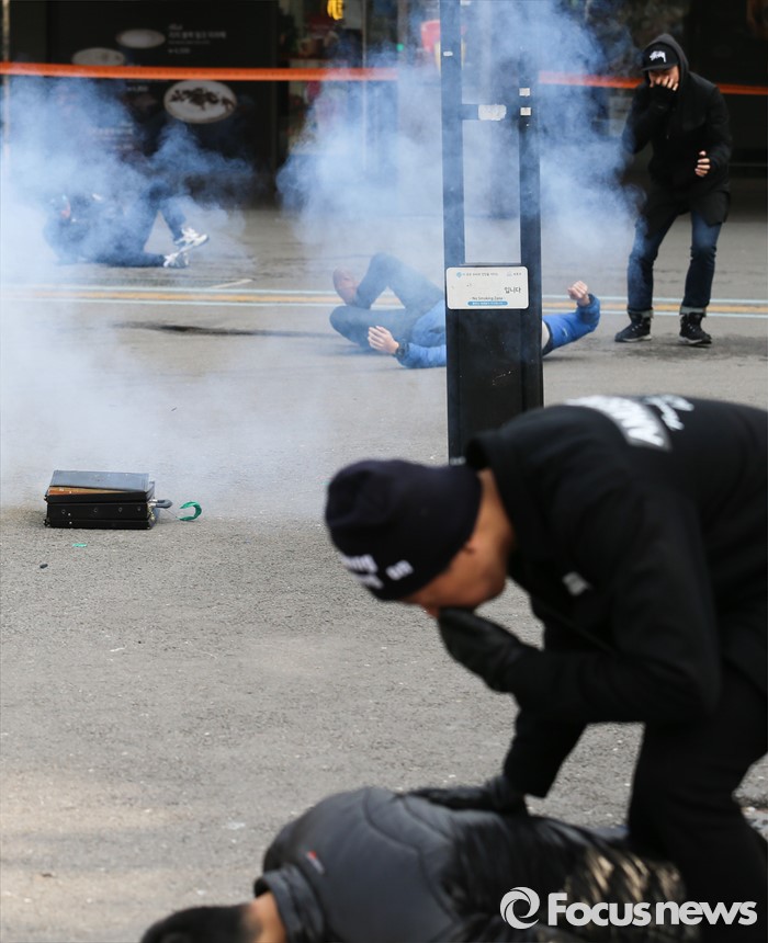 (서울=포커스뉴스) 15일 오후 서울 서초구 고속터미널 광장에서 훈련 참가자들이 시민안전확보를 위한 유관기관 합동 대테러 종합훈련을 하고 있다.
