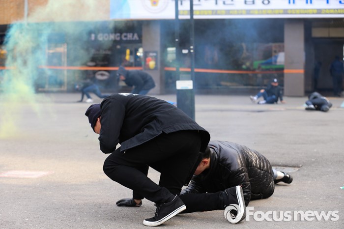 (서울=포커스뉴스) 15일 오후 서울 서초구 고속터미널 광장에서 훈련 참가자들이 시민안전확보를 위한 유관기관 합동 대테러 종합훈련을 하고 있다.