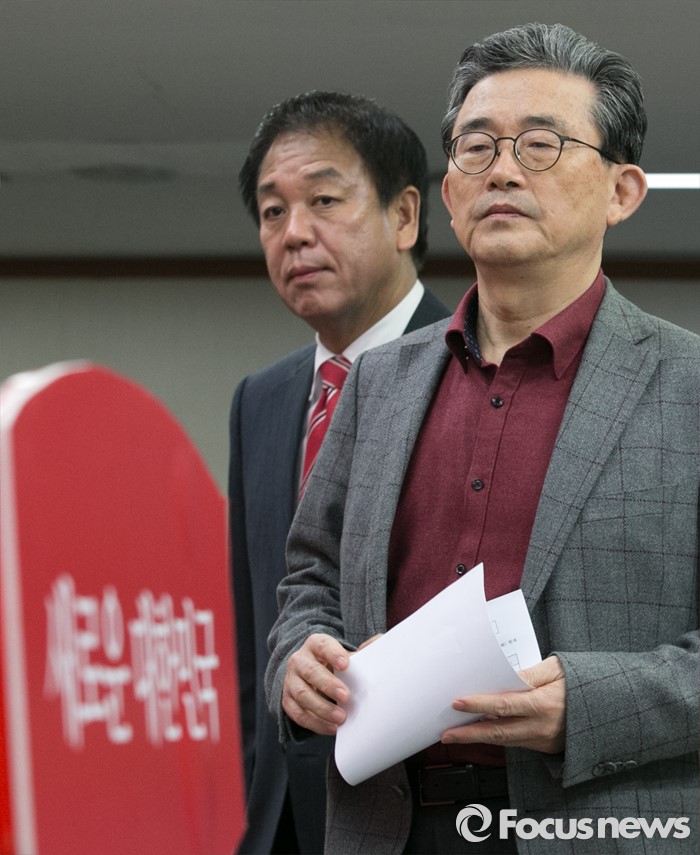 (서울=포커스뉴스) 이한구(오른쪽) 새누리당 공천관리위원장과 박종희 제2사무부총장이 15일 오후 서울 여의도 당사에서 20대 총선 3차 경선결과를 발표를 위해 입장하고 있다. 이날 새누리당 공천관리위원회는 서울 종로구 선거구에 오세훈 전 서울시장이 경선 후보로 확정됐다고 전했다.