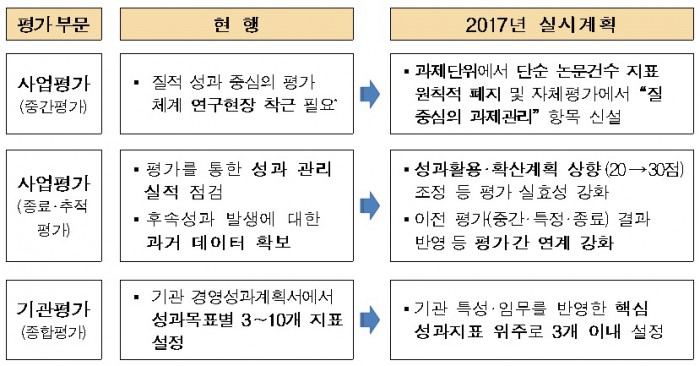 박필환 미래부 성과평가혁신관은 “질 중심 성과평가의 현장정착 및 자체평가 중심의 자율적인 평가체계 전환의 정착으로 연구자들이 본연의 임무에 집중할 수 있도록 지원해 나갈 계획” 이라고 강조했다.성과 중심의 평가체계가 정착 위한 미래부 국가연구개발 평가 개선안.<표제공=미래부>