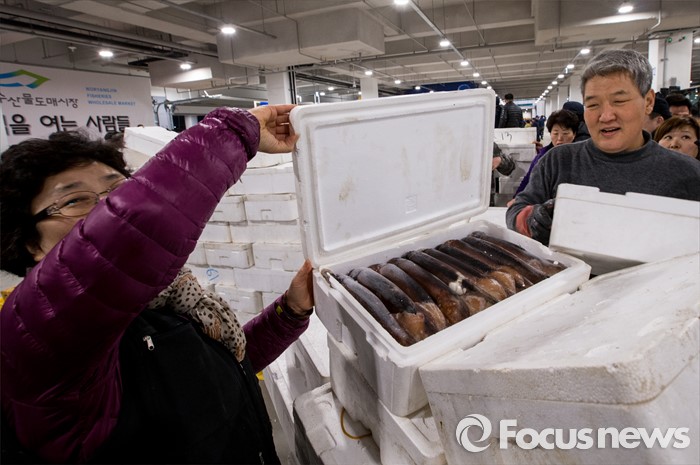 (서울=포커스뉴스) 16일 오전 서울 노량진 수산시장 현대화 건물 경매장에서 상인들이 첫 경매에 낙찰 받은 오징어를 옮기고 있다. 이날 경매를 시작으로 현대화 건물에서의 개장이 이뤄졌지만, 절반 넘는 상인들이 좁아진 상가 공간과 비싸진 임대료를 주장하며 옛 건물에 남은 채 이전을 거부 중인 상황이다.