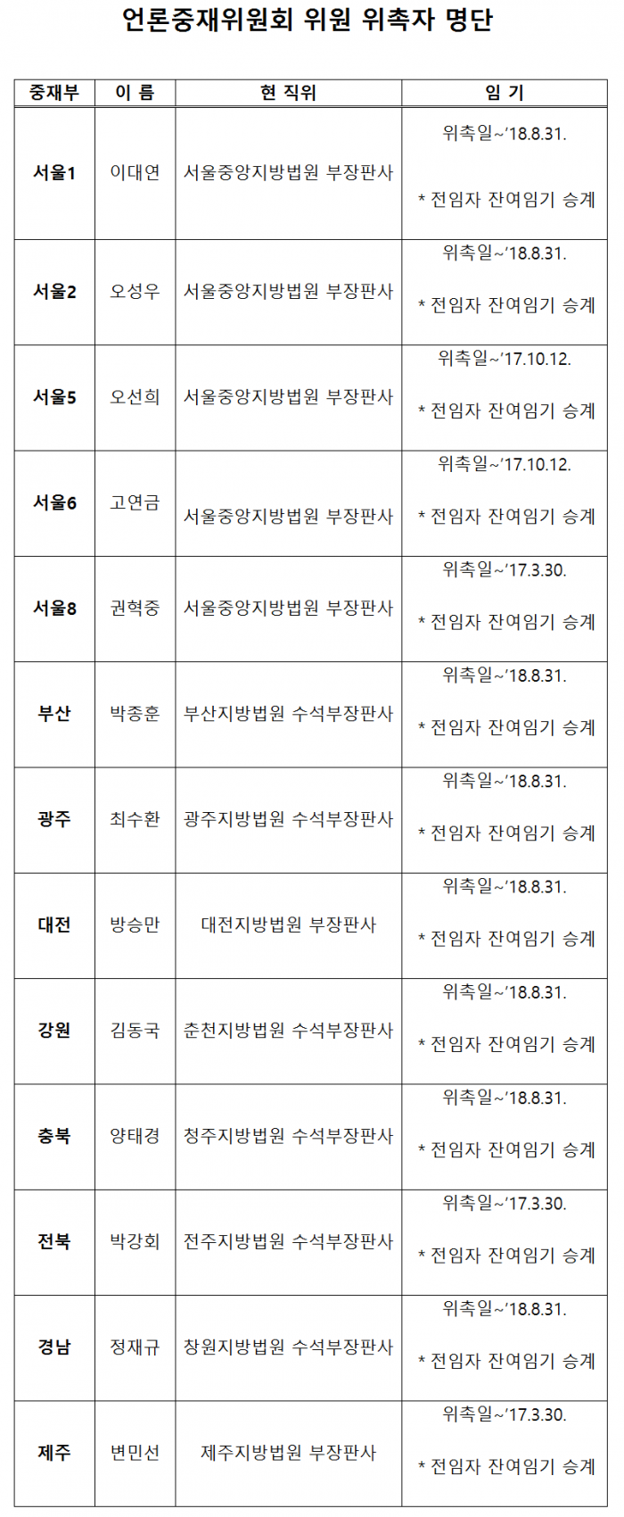 이번에 13명의 중재위원을 위촉함에 따라 전체 언론중재위원회 90명은 법관 18명, 변호사 18명, 전직 언론인 22명, 학계 32명 등으로 구성됐다.언론중재위원회 윈원 위촉자 명단.<사진제공=문화체육관광부>