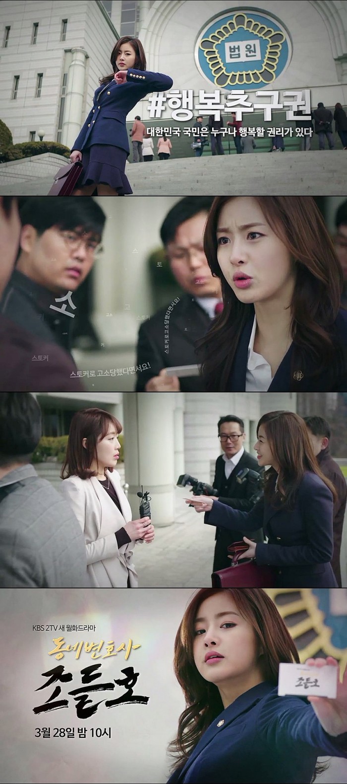 KBS는 16일 네이버 TV캐스트에 새 월화드라마 '동네변호사 조들호'의 티저 영상을 공개했다. 영상 속 신입 변호사 이은조(강소라 분)는 법원 앞에 서있다.