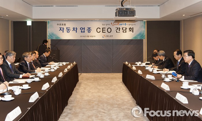 오 부사장은 “회사의 지속적인 발전을 위해 2016년이 얼마나 중요한지 노사가 공감하고 있으며, 이를 통해 올해도 원만한 협상 타결이 예상된다”고 덧붙였다.16일 서울 플라자호텔에서 진행된 이기권 고용노동부장관과 국내 완성차ㆍ자동차 부품업종 CEO와의 간담회 현장. (왼쪽 열 두 번째 오직렬 르노삼성자동차 부사장, 오른쪽 열 첫 번째 이기권 고용노동부장관) <사진제공=르노삼성자동차>