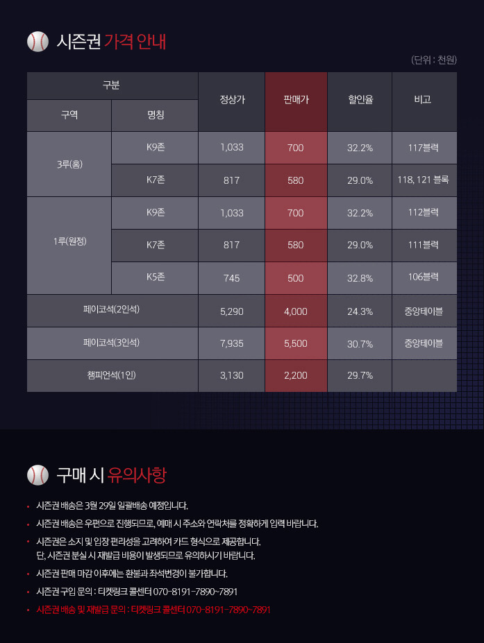 KIA 홈경기 72경기를 기준으로 중앙테이블 2인석 400만원, 3인석 550만원이다. 챔피언석은 1인 기준 220만원이다. 내야지정석 K9존은 70만원, K7존은 58만원, K5존은 50만원에 각각 판매한다. 정상가 대비 24.3~32.8% 할인된 가격이다. 티켓링크에서 오는 25일까지 구입할 수 있다.