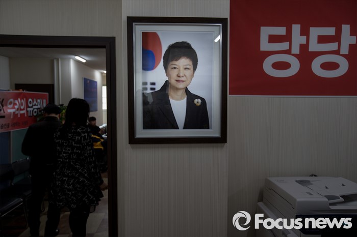 (대구=포커스뉴스) 새누리당이 유승민(대구 동구을) 의원에 대한 공천 배제안을 놓고 고민하고 있는 16일 오전 대구 동구 유 의원 선거사무소에 박근혜 대통령 사진이 걸려 있다.