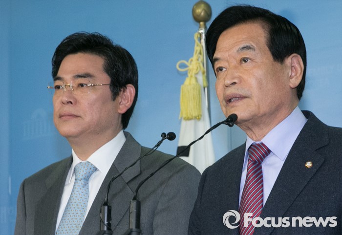 (서울=포커스뉴스) 20대 총선 공천 배제(컷오프)된 서상기(오른쪽), 홍지만 새누리당 의원이 16일 오전 서울 여의도 국회 정론관에서 불출마 선언 및 당 결정 수용 기자회견을 하고 있다.