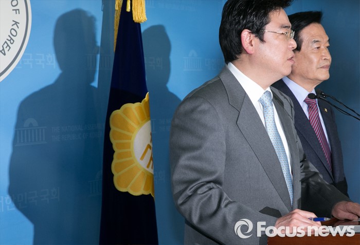 (서울=포커스뉴스) 20대 총선 공천 배제(컷오프)된 서상기(오른쪽), 홍지만 새누리당 의원이 16일 오전 서울 여의도 국회 정론관에서 불출마 선언 및 당 결정 수용 기자회견을 하고 있다.