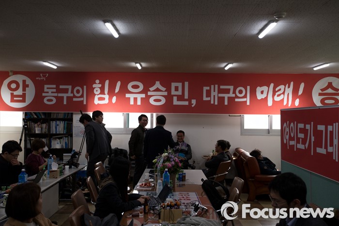 (대구=포커스뉴스) 새누리당이 유승민(대구 동구을) 의원에 대한 공천 배제안을 놓고 고민하고 있는 16일 오전 대구 동구 유 의원 선거사무소에 취재진 및 지지자들이 모여 있다.