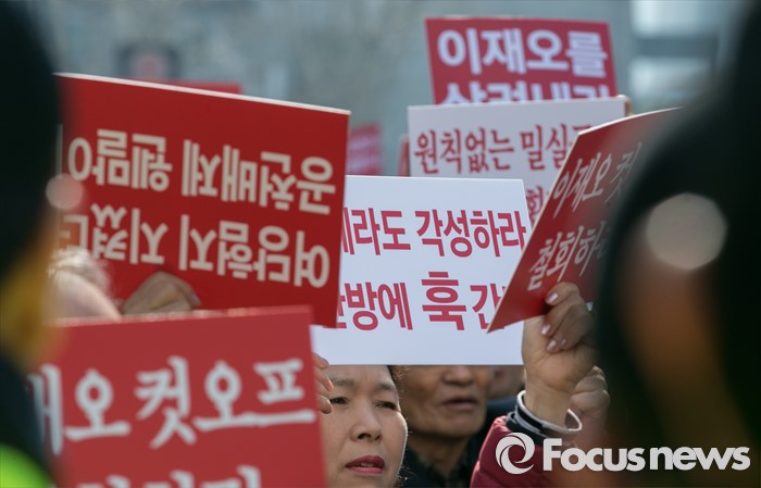 (서울=포커스뉴스) 16일 오전 서울 여의도 새누리당사 앞에서 공천 배제(컷오프)된 이재오 의원의 지지자들이 공천관리위원회의 결정 철회를 촉구하는 집회를 하고 있다.