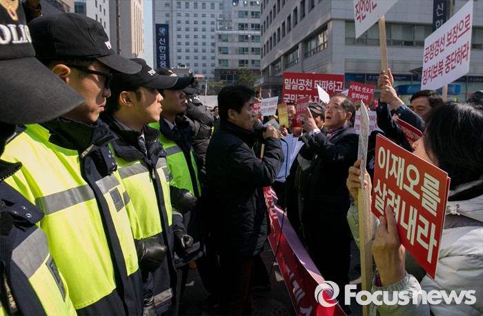 (서울=포커스뉴스) 16일 오전 서울 여의도 새누리당사 앞에서 공천 배제(컷오프)된 이재오 의원의 지지자들이 공천관리위원회의 결정 철회를 촉구하는 집회를 하고 있다.