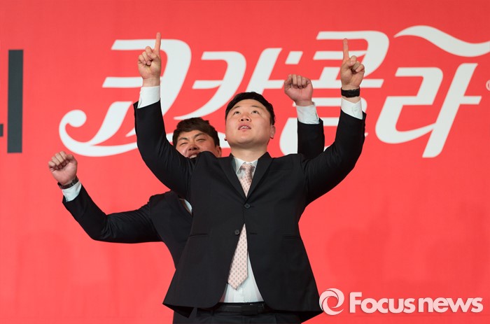 (서울=포커스뉴스) 16일 오전 서울 중구 더플라자호텔 그랜드볼룸에서 제21회 코카콜라 체육대상 시상식에 참석한 봅슬레이 대표 원윤종(앞)과 서영우가 최우수선수상 수상 세리머니를 하고 있다.