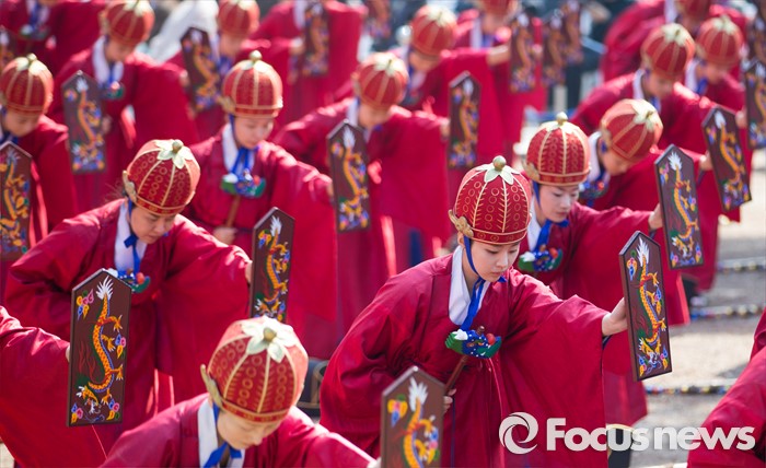 (서울=포커스뉴스) 16일 오전 서울 종로구 성균관 대성전에서 열린 '2016 춘기석전대제'에서 일무보존회 회원들이 일무를 추고 있다.