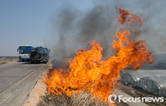 (청주=포커스뉴스) 16일 오후 충북 청주시 흥덕구 신대동 차로 바로 옆에서 눈두렁이 태우기를 하고 있어 지나는 차량에 위협이 되고 있다.