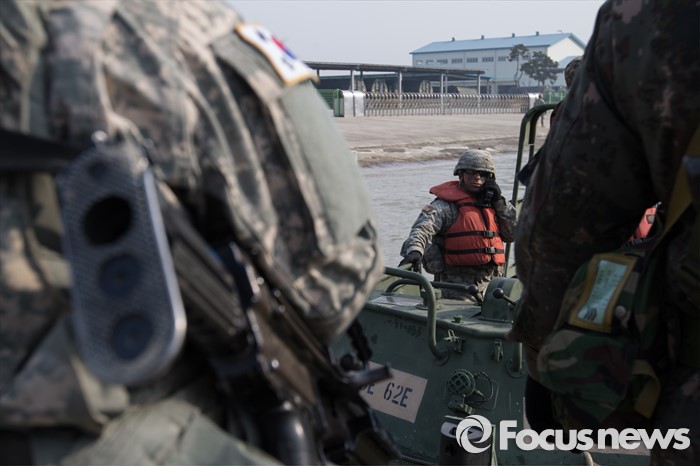 (이천=포커스뉴스) 16일 오전 경기도 이천시 7공병여단 도하훈련장에서 한국군 제7공병여단 도하대대와 미군 제2전투항공여단 공병대대 장병들이 한미 연합 도하훈련 준비를 하고 있다.