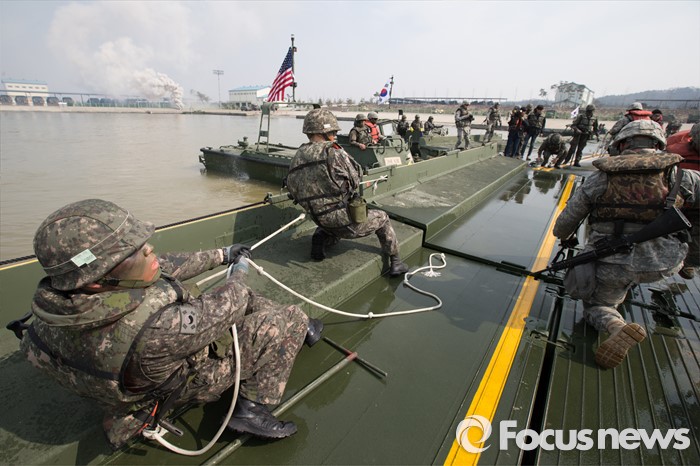 (이천=포커스뉴스) 16일 오전 경기도 이천시 7공병여단 도하훈련장에서 열린 '한·미 연합 소부대 도하훈련'에서 한국군 제7공병여단 도하대대와 미군 제2전투항공여단 공병대대 장병들이 부교를 설치하고 있다.