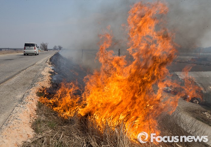 (청주=포커스뉴스) 16일 오후 충북 청주시 흥덕구 신대동 차로 바로 옆에서 눈두렁이 태우기를 하고 있어 지나는 차량에 위협이 되고 있다.
