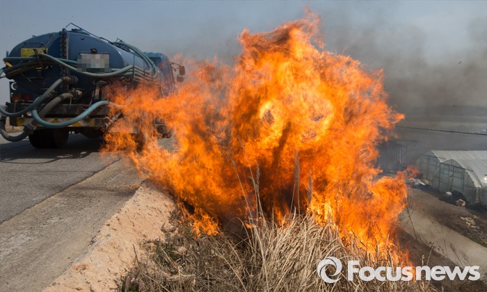 (청주=포커스뉴스) 16일 오후 충북 청주시 흥덕구 신대동 차로 바로 옆에서 눈두렁이 태우기를 하고 있어 지나는 차량에 위협이 되고 있다.