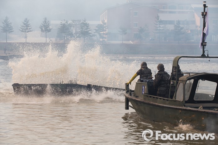 (이천=포커스뉴스) 16일 오전 경기도 이천시 7공병여단 도하훈련장에서 열린 '한·미 연합 소부대 도하훈련'에서 한국군 제7공병여단 도하대대 장병들이 부교 설치 작업을 하고 있다.