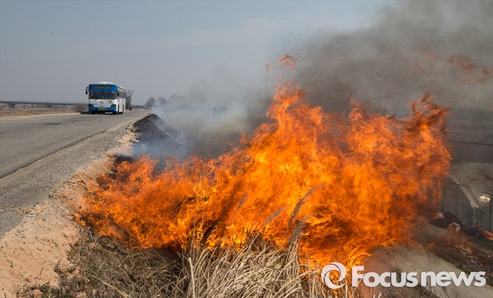 (청주=포커스뉴스) 16일 오후 충북 청주시 흥덕구 신대동 차로 바로 옆에서 눈두렁이 태우기를 하고 있어 지나는 차량에 위협이 되고 있다.