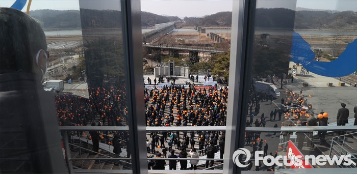 (파주=포커스뉴스) 16일 오후 경기도 파주시 임진각 망배단에서 개성공단 입주기업, 영업기업, 협력기업 등 대표를 비롯한 임직원과 가족들이 '개성공단 평화대행진 집회'를 하고 있다.
