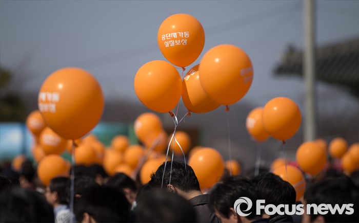 (파주=포커스뉴스) 16일 오후 경기도 파주시 임진각 망배단에서 개성공단 입주기업, 영업기업, 협력기업 등 대표를 비롯한 임직원과 가족들이 '개성공단 평화대행진 집회'를 하고 있다.