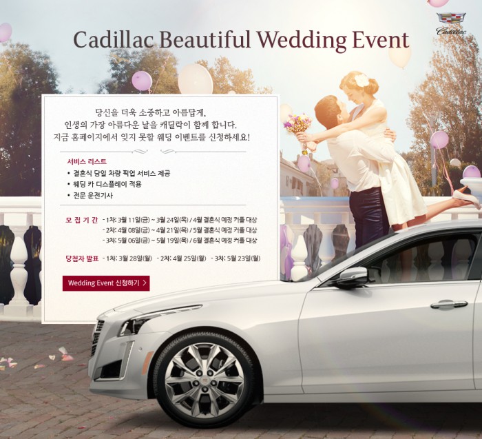 캐딜락은 예식을 앞둔 예비 부부를 대상으로 올 3월부터 5월까지 매 월 추첨을 통해 세단 캐딜락 CTS를 웨딩카로 지원한다.이벤트에 선정된 예비 부부는 예식 당일 예식 준비에서부터 예식 후 공항 또는 호텔까지 의전 서비스를 제공받는다.