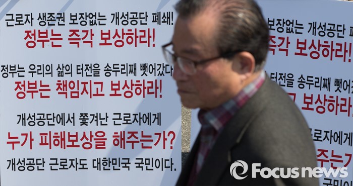 (파주=포커스뉴스) 16일 오후 경기도 파주시 임진각 망배단에서 개성공단 입주기업, 영업기업, 협력기업 등 대표를 비롯한 임직원과 가족들이 '개성공단 평화대행진 집회'를 하고 있다.