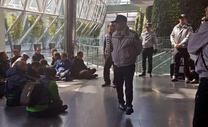 김 본부장은 기자회견문에서 "정부의 성과퇴출제 강행을 무조건 따르는 서울시는 즉각 성과급 지급을 철회하고 고통받는 서울시 5만 공무원들의 원성을 헤아려 주길 바란다"고 말했다.전국공무원노동조합 서울지역본부 소속 공무원들이 16일 낮 12시 시청 본관 1층에서 성과급제 도입 철회를 주장하고 있다. 2016.03.16 이균진 기자 qwe123@focus.co.kr