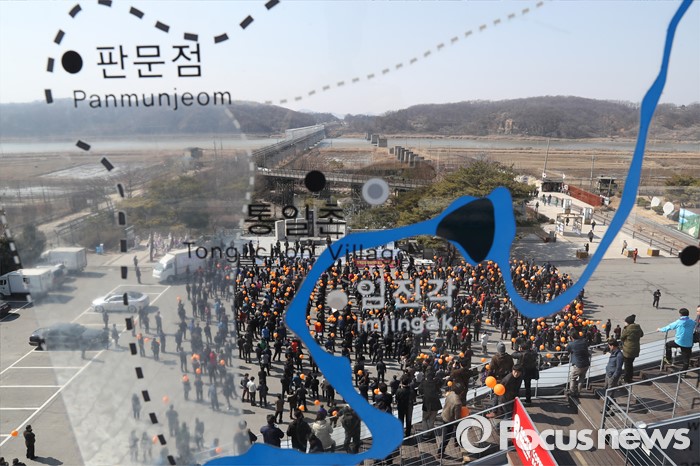 (파주=포커스뉴스) 16일 오후 경기도 파주시 임진각 망배단에서 개성공단 입주기업, 영업기업, 협력기업 등 대표를 비롯한 임직원과 가족들이 '개성공단 평화대행진 집회'를 하고 있다.