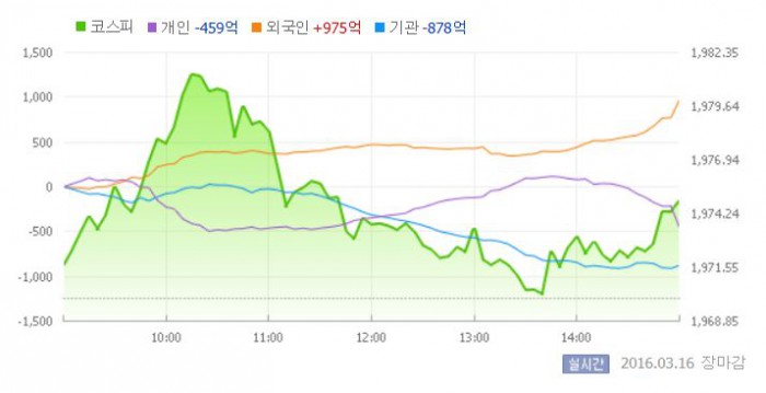 16일 코스피지수는 전일 대비 0.25%(4.93포인트) 오른 1974.90에 장을 마쳤다. 코스닥지수는 전날 보다 0.01%(0.10포인트) 상승한 693.44에 마감했다.