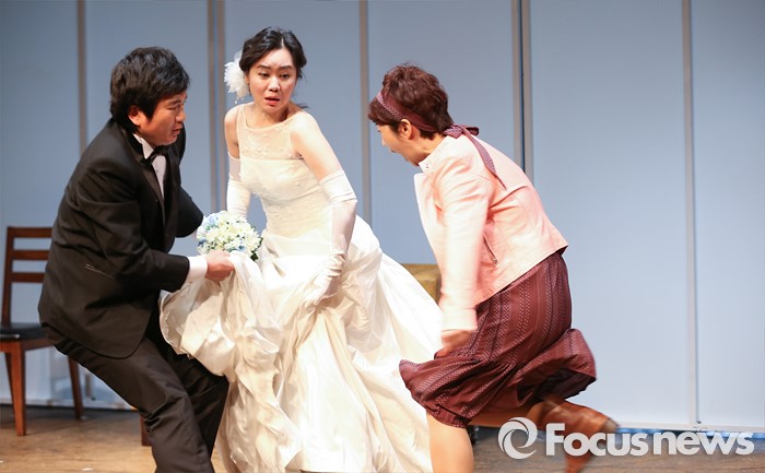 (서울=포커스뉴스) 16일 오후 서울 종로구 미마지아트센터 눈빛극장에서 열린 연극 '두 코리아의 통일' 프레스콜에 참석한 배우 정나진(왼쪽부터), 성여진, 김시영이 주요장면을 시연하고 있다.