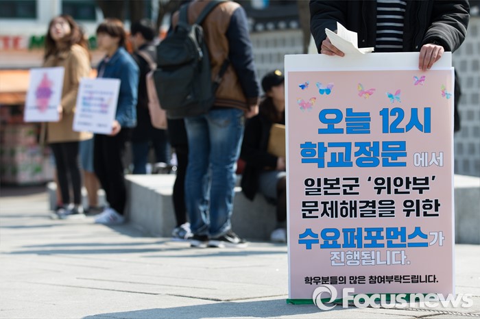 (서울=포커스뉴스) 16일 오후 서울 종로구 성균관대학교 정문 앞에서 학생들이 일본군 위안부 문제해결을 위한 서명운동을 하고 있다.