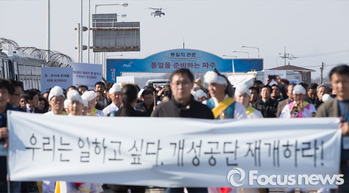 (파주=포커스뉴스) 16일 오후 경기도 파주시 통일대교에서 개성공단 입주기업, 영업기업, 협력기업 등 대표를 비롯한 임직원과 가족들이 '개성공단 평화대행진 집회'를 마치고 임진각 망배단으로 향하고 있다.