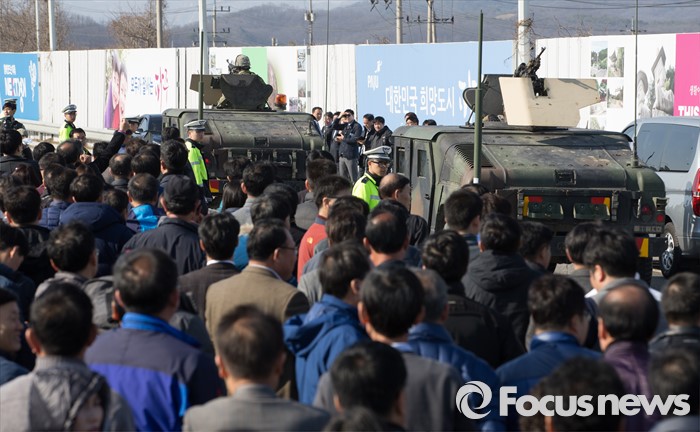 (파주=포커스뉴스) 16일 오후 경기도 파주시 통일대교에서 개성공단 입주기업, 영업기업, 협력기업 등 대표를 비롯한 임직원과 가족들이 '개성공단 평화대행진 집회'를 하고 있는 가운데 미군 험비가 지나가고 있다.